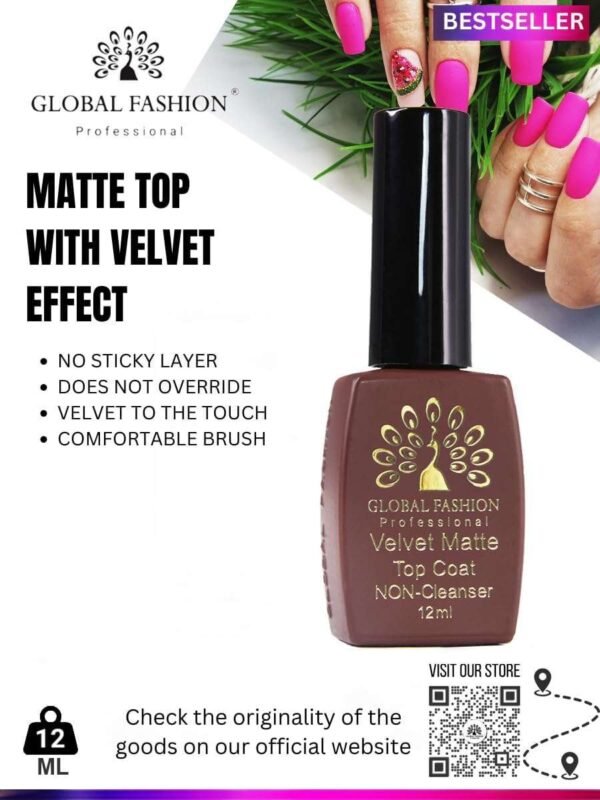 Easily turn your glossy gel polish coat into a matte one with Velvet Matte Top Coat! The finish is made of high quality American raw materials. It is easy to apply, quickly self-levels, has a perfect matte effect, does not fade during wear. The top protects against chipping and retains the color of the gel polish. After drying the top, your nails are velvety, corduroy to the touch. Velvet Matte Top Coat provides long-lasting coverage and allows you to keep your manicure for up to 3 weeks. The top is applied as the final step in a three-phase system and has no sticky layer.